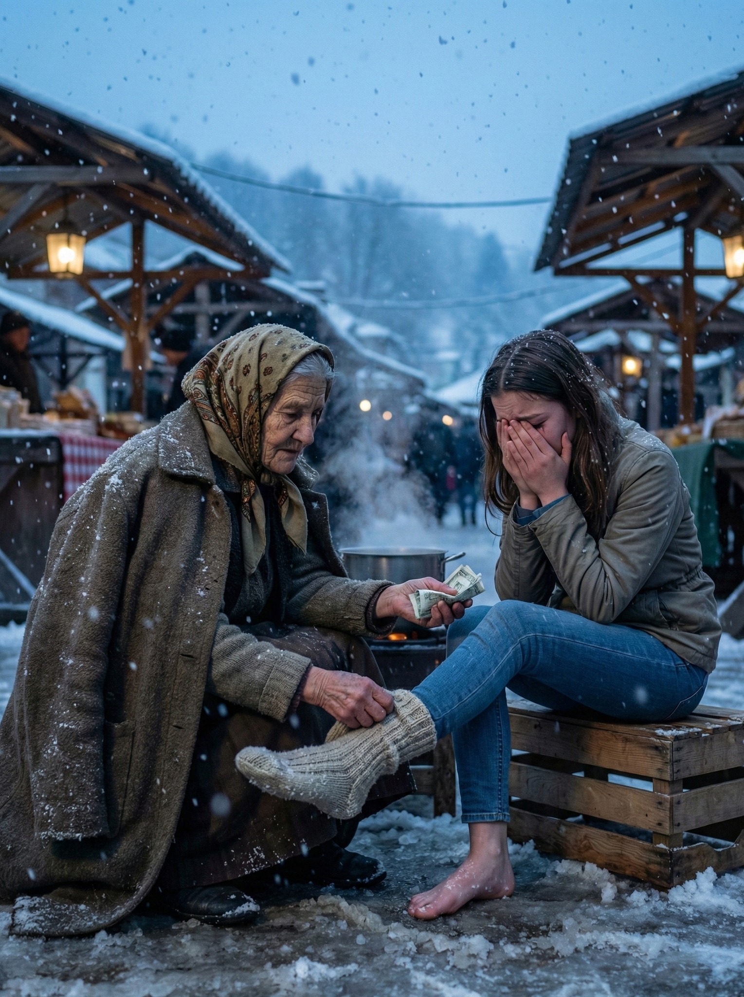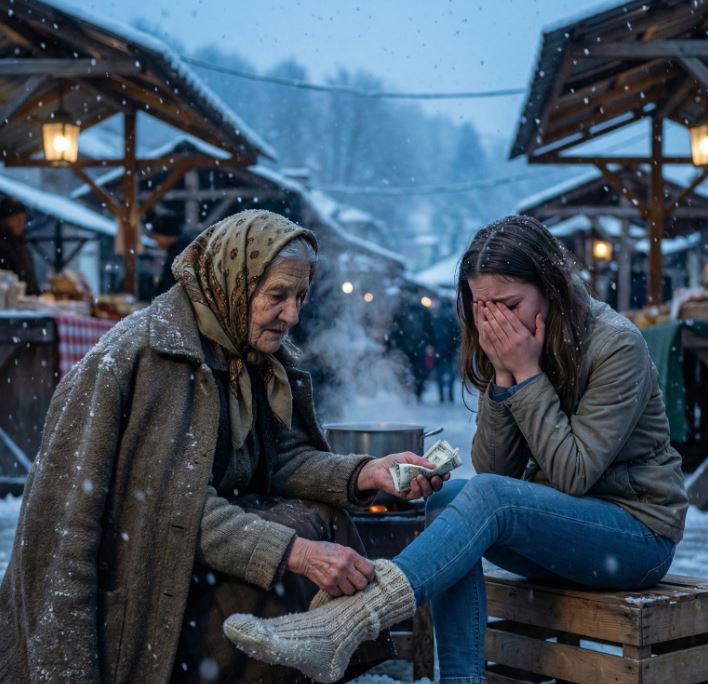 Kroz suze je ispričala da joj je ukraden novčanik s posljednjim novcem koji je imala za povratak u studentski dom. Nije plakala samo zbog novca, već zbog osjećaja potpune izgubljenosti i straha.Ruža nije postavljala dodatna pitanja. U njenom pogledu nije bilo sažaljenja, već razumijevanja. Bez razmišljanja je:uzela najdeblje vunene čarape koje je čuvala za posebne prilike,dala joj topli šal,obula joj čarape vlastitim rukam,izvadila sav dnevni pazar i stavila joj novac u dlan