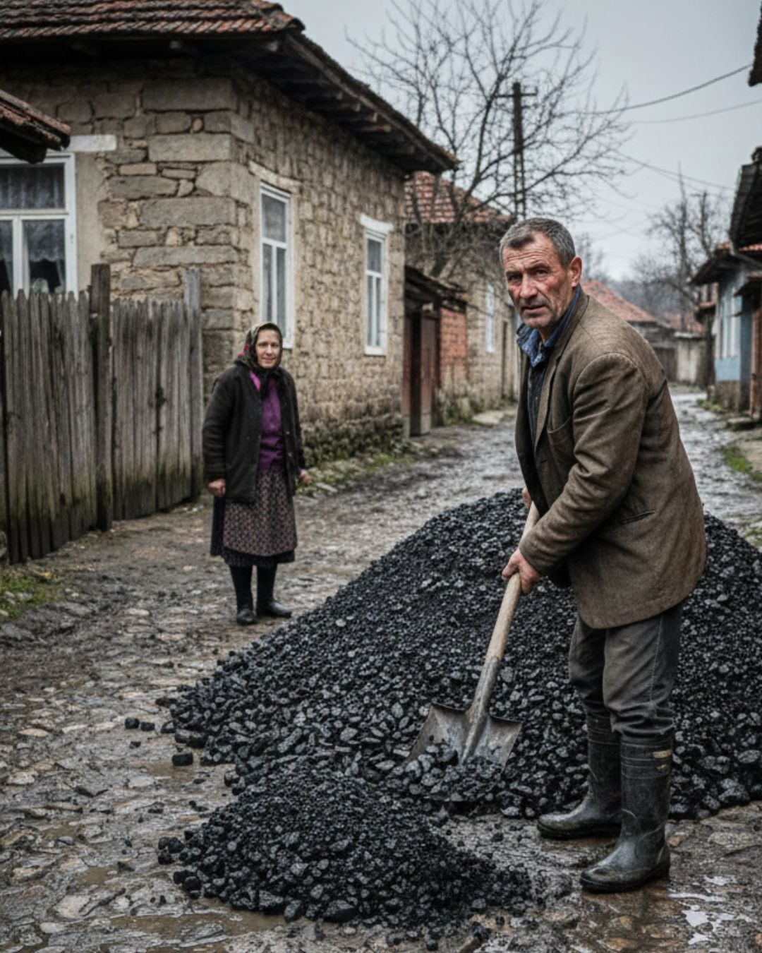 • Međutim, odgovor koji je dobila bio je grub i bez imalo empatije. Bez gašenja motora, vozač je istovario dve tone uglja direktno ispred Ružine kapije, potpuno blokirajući ulaz. Crna prašina se podigla, mešajući se sa sitnom kišom, pretvarajući prizor u simbol potpune nepravde. Baka Ruža je ostala sama pred crnom gomilom koja je za nju predstavljala nemoguću misiju.