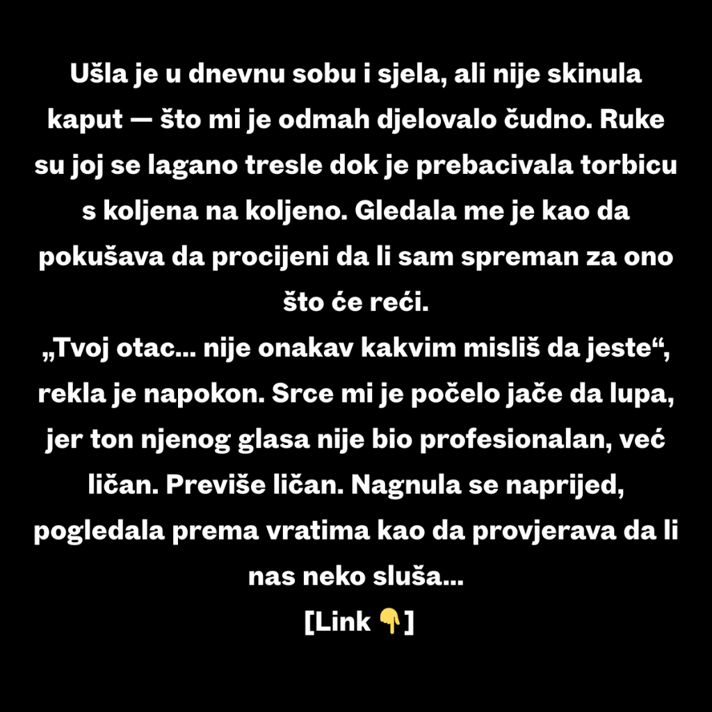 Dok je sedela nasuprot meni, nije skidala pogled sa mojih ruku, koje su se same drhtale. Iako se trudila da zadrži profesionalan ton, iz nje je izbila duboka tuga. „Tvoj otac… nije bio iskren prema tebi“, izgovorila je, a reči su me kao munja pogodile. Možda sam znao da nešto nije u redu, ali nikada nisam mogao da pretpostavim koliko duboko seže ta tajna. Moje misli su bile u haosu, ali nisam mogao da prekinem ovu ženu, nisam mogao da prestanem da slušam. Pokušao sam da dobijem više informacija, ali ona je podigla ruku, kao da me moli da se smirim. „Nisam došla da branim njega“, dodala je. „Došla sam da te zaštitim.“