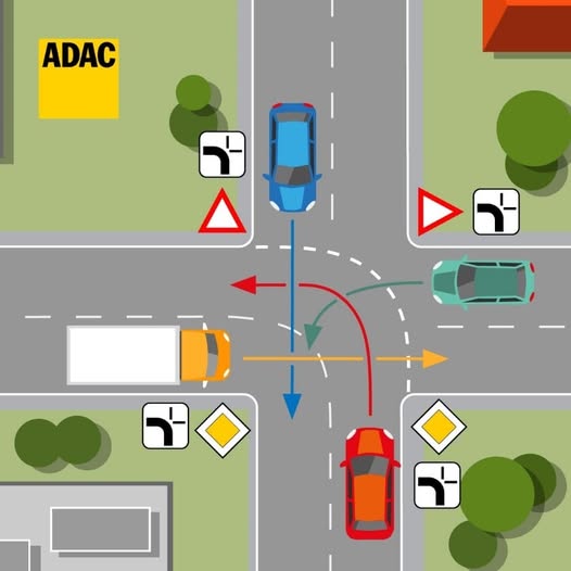 Prilikom prolaska kroz raskrsnicu bez semafora, sve počinje od posmatranja znakova. Ako ste u vozilu koje se kreće putem sa pravom prvenstva prolaza, imate prednost u odnosu na one koji nailaze sa sporednih puteva. U slučaju iz primera koji je izazvao dosta pažnje, prvi kroz raskrsnicu prolazi crveni automobil. On zadržava pravo prvenstva zato što se kreće putem na kome to jasno važi. Nakon njega sledi žuti kamion, jer i on dolazi sa glavnog puta, ali skreće na sporedni, što ga stavlja u specifičan položaj – ipak i dalje zadržava prednost nad onima koji tek ulaze sa puta nižeg prioriteta.