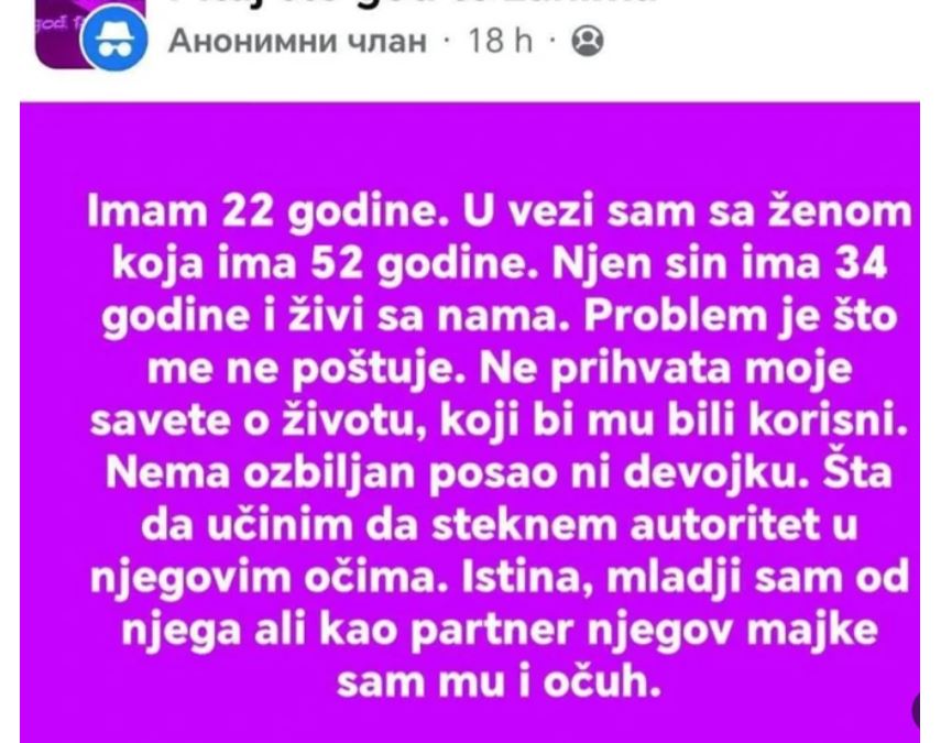 - Naime, mladić tvrdi da sin njegove partnerke nije spreman da prihvati njegovu poziciju u porodici i ne poštuje njegove savete, što stvara napetost u celokupnoj situaciji. Mladić često oseća da ne doživljava autoritet, jer nema ozbiljan posao i njegova pozicija u porodici deluje nesigurno. Ovaj nesklad je izazvan, između ostalog, i činjenicom da je mladić mlađi od sina svoje partnerke, što dodatno otežava ulogu očuha. Stereotipi o tome kako bi porodica trebalo da funkcioniše, posebno u tradicionalnom smislu, postavljaju dodatne prepreke ovom nesvakidašnjem porodičnom okruženju.