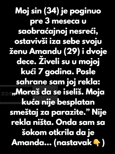 Suočila sam je s time. Rekla sam da je vrijeme da ode. Da ovo nije više njezin dom. Amanda se slomila. Nazvala me hladnim čudovištem, zgrabila djecu i otišla bez riječi. Nije se javila više nikada. Ni porukom, ni pozivom. Nisam saznala gdje su otišli, kod koga, kako žive.