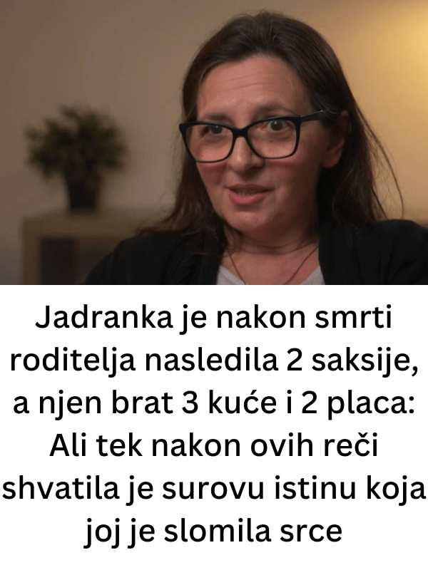 - Jadranka je, nakon smrti svojih roditelja, nasledila samo dve saksije, dok je njen brat preuzeo tri kuće, dva placa i veliku količinu imovine. Iako je u početku sve izgledalo kao običan porodični nesporazum, tek kasnije je shvatila duboku surovu istinu koja ju je potpuno slomila.