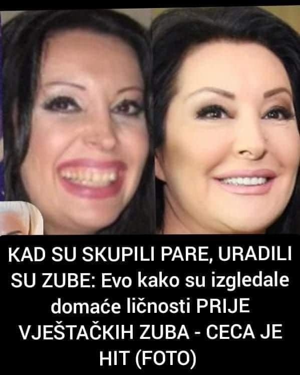 • Ceca Ražnatović, poznata pop pevačica, primer je umetnice koja se nije libila uložiti u korekciju zuba. Po mišljenju mnogih, njen prepoznatljiv osmeh, sada sa savršeno belim zubima, postao je jedan od zaštitnih znakova njene javne ličnosti. Blic otkriva da je Ceca, kao i mnogi drugi, uložila u dentalne intervencije i promenila svoj izgled, što joj je omogućilo da se još više istakne na estradi.