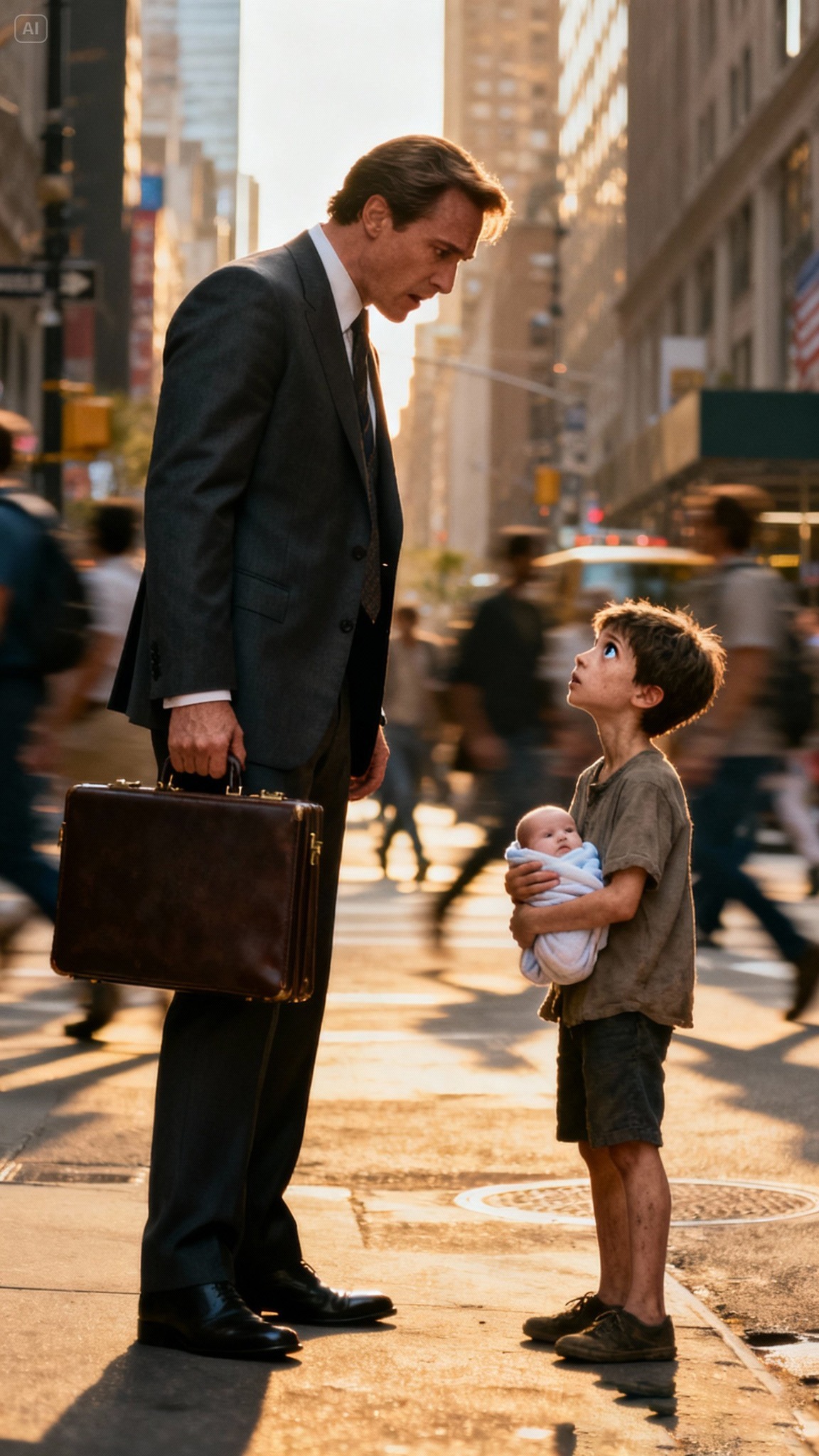 Na ulici, među bukom i užurbanim koracima prolaznika, Ethan je začuo tihi glas koji ga je potpuno zaustavio. Pred njim je stajao dječak, iscrpljen i prljav, ne stariji od sedam godina, u naručju noseći bebu umotanu u ćebe. Riječi koje je izgovorio odjeknule su u Ethanovoj glavi: „Gospodine, treba li vam beba?“ U tom trenutku njegova ravnodušnost je pukla. Dječak se zvao Leo, a beba je bila njegova sestra Maša. Majka ih je ostavila već dva dana ranije, ne ostavljajući im ništa osim nade da će se vratiti.