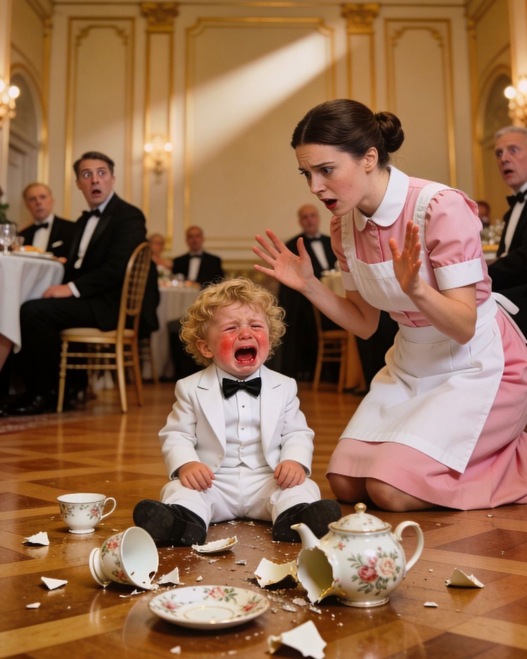 Na samom centru događanja stajao je osmogodišnji dečak, sav u elegantnoj odeći, ali potpuno zbunjen i emotivno iscrpljen. Njegova ramena su bila napeta, a ruke ukočene, kao da je i njegovo telo bilo preopterećeno događajem koji je upravo odjeknuo. Nije bilo besa, kako bi mnogi očekivali, već strah i preopterećenost, emocije koje nijedno dete ne bi trebalo da nosi.