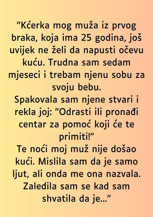 • Naizgled obična svakodnevica pretvorila se u prostor pun tenzija kada se 25-godišnja djevojka, koja je godinama živjela kod oca, suočila sa neočekivanom odlukom svoje maćehe. Prema onome što „Blic“ naglašava, u trenutku kada se u kući pojavila vijest o dolasku bebe, sve dotadašnje rutine i međusobni odnosi počeli su da se preispituju, a prostor koji je ranije bio dovoljan odjednom je postao premalen.