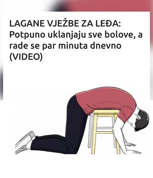- S druge strane, postoji i pitanje bolova u donjem dijelu leđa, što je sve češća pojava. Dugotrajno sjedenje, pogrešni pokreti ili naprezanje mogu uzrokovati neugodne bolove. Ipak, postoje jednostavne vježbe koje mogu donijeti veliko olakšanje. Primjerice, sjedenje na podu s ispruženim nogama i savijanjem tijela prema naprijed uz podršku peškira ili jastuka može smanjiti napetost mišića. Ovakva vježba, ako se praktikuje redovno, doprinosi rasterećenju donjeg dijela leđa i vraćanju fleksibilnosti.