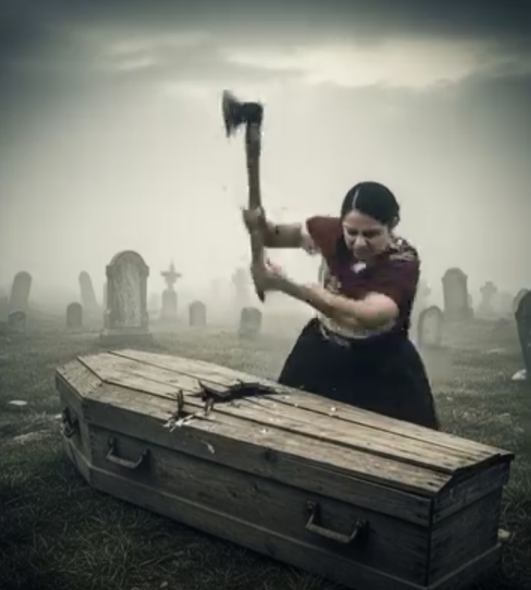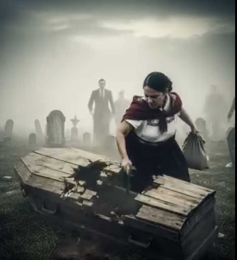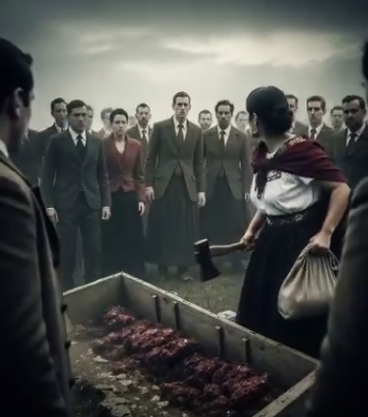 • Sahrana je postala još zagonetnija kad je majka na groblje stigla u plavom kaputu, što je već iznenadilo sve prisutne, jer je to bilo neobično za ovakve prilike. U njenoj ruci bila je velika crna torba koja je odmah pobudila znatiželju. Ništa nije ukazivalo na ono što će uslediti. Dok su svi čekali trenutak kada će poklopac kovčega biti pričvršćen, majka je iz torbe izvadila sjekiru. Prvi udarac sekire po poklopcu ostavio je sve u šoku, a drvo je počelo da puca pod njenim snažnim udarcima. Zvuk sekire koja udara odjekivao je tišinom groblja, stvarajući atmosferu koja je bila istovremeno zastrašujuća i nevjerovatna. Nijedna osoba prisutna na tom mestu nije mogla da shvati šta se zapravo dešava.