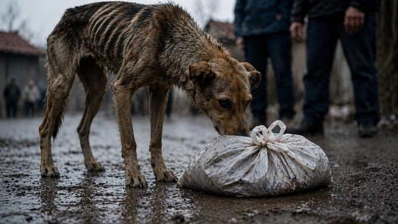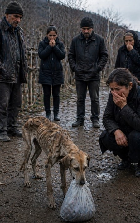 Iz tame šume prvo se čuo šum granja, a zatim i tihi šapat ljudi koji su primijetili pokret. Ono što su ugledali bilo je potresno. Između drveća pojavila se izuzetno iscrpljena ženka psa, čije je tijelo bilo toliko slabo da su se rebra jasno ocrtavala ispod tanke kože. Kretala se sporo, gotovo na ivici pada, ali je uporno išla naprijed. Nije ispuštala zvuk, nije pokazivala agresiju niti strah. U njenim ustima nalazila se plastična vrećica, pažljivo stegnuta kao da nosi nešto od neprocjenjive vrijednosti.
