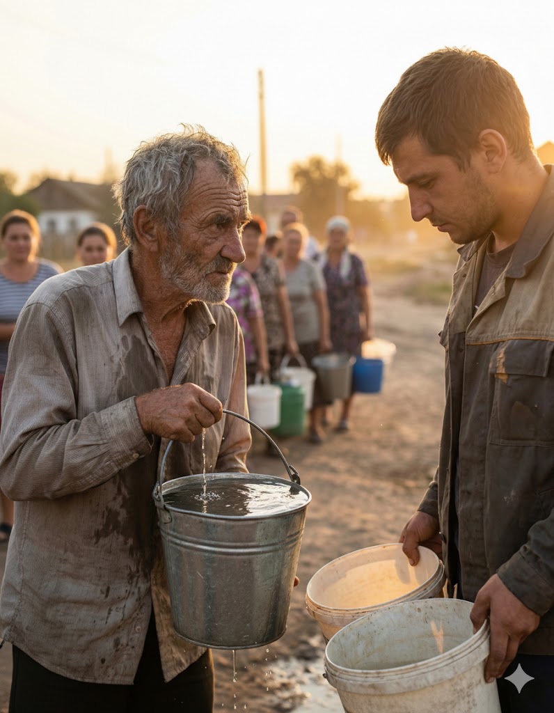 • Živko je pocrveneo, stegao kante i, tiho, priznao: „Izvini, Milorade. Pogrešio sam. Svi smo pogrešili… Deca su mi žedna… Ako možeš… samo malo…” Milorad je tada ustao, prišao rupi i napunio kantu. „Uzmi, Živko. Sipaj,” rekao je, gledajući ga smireno. I dok su ostali meštani stajali u čudu, Milorad je dodao: „Voda je božija. Ja sam je pronašao, ali je Bog dao svima.” Živko je prihvatio vodu, dok je Milorad tiho dodao: „Zapamti, komšija. Ova voda će ti oprati blato sa cipela, ali nema te vode koja može da opere obraz čoveku koji se smeje tuđoj muci.”