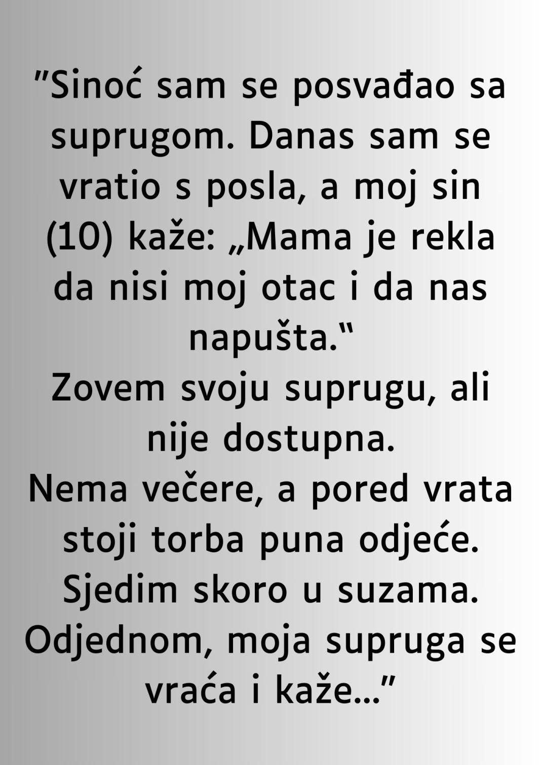 Sljedeći dan je počeo kao svaki drugi. On je otišao na posao, nadajući se da će se stvari smiriti, kao što je to obično bilo nakon manjih nesuglasica. Međutim, toga dana ga je dočekalo nešto što nikada nije mogao predvidjeti. Njegov desetogodišnji sin stajao je pred njim, blijed i nesiguran, kao da se boji reći nešto što je majka izgovorila. I onda je sin tiho, gotovo šapatom, izgovorio rečenicu koja mu je presjekla dah: „Mama je rekla da nisi moj tata… i da nas napušta.“