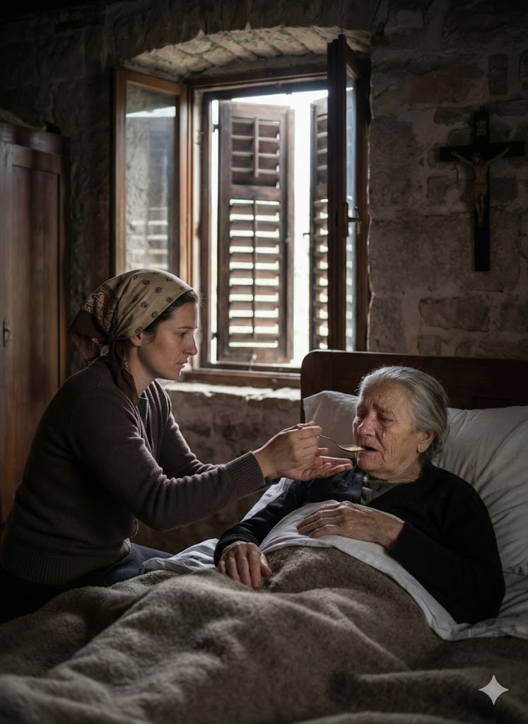 - U toj tišini, kada su sati prolazili sporo i bolno, vrata su se otvorila. Na pragu je stajala snaha. Bez reči, bez optužbe, sa lavorom tople vode i tanjirom supe. Umesto osvete, donela je negu. Umesto prezira, strpljenje. Dodir njene ruke bio je blag, gotovo svet. Nije brisala samo telo, već i godine poniženja koje je prećutno nosila. Starica je očekivala hladnoću, ali je dočekala saosećanje.