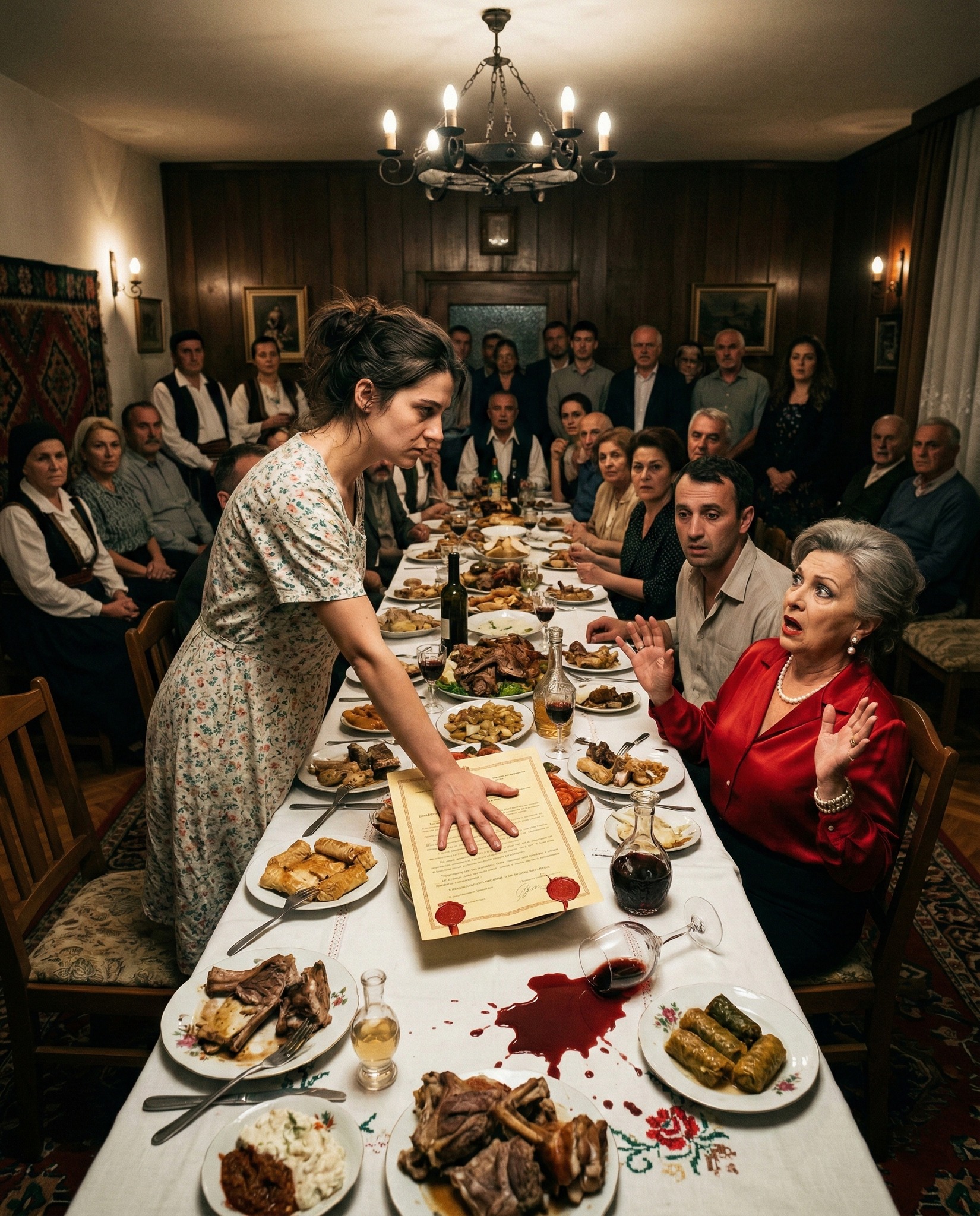 Polako je skinula kecelju i ostavila je na stolici. U tišini koja je zavladala, prišla je komodi, izvadila požutjelu fasciklu i vratila se pred svekrvu. Glas joj je bio miran, ali odlučan. Iz fascikle je izvukla papir sa sudskim pečatom i spustila ga na sto. Čaša vina se prevrnula, crvena tečnost razlila po bijelom stolnjaku, a simbolika tog prizora bila je snažna.