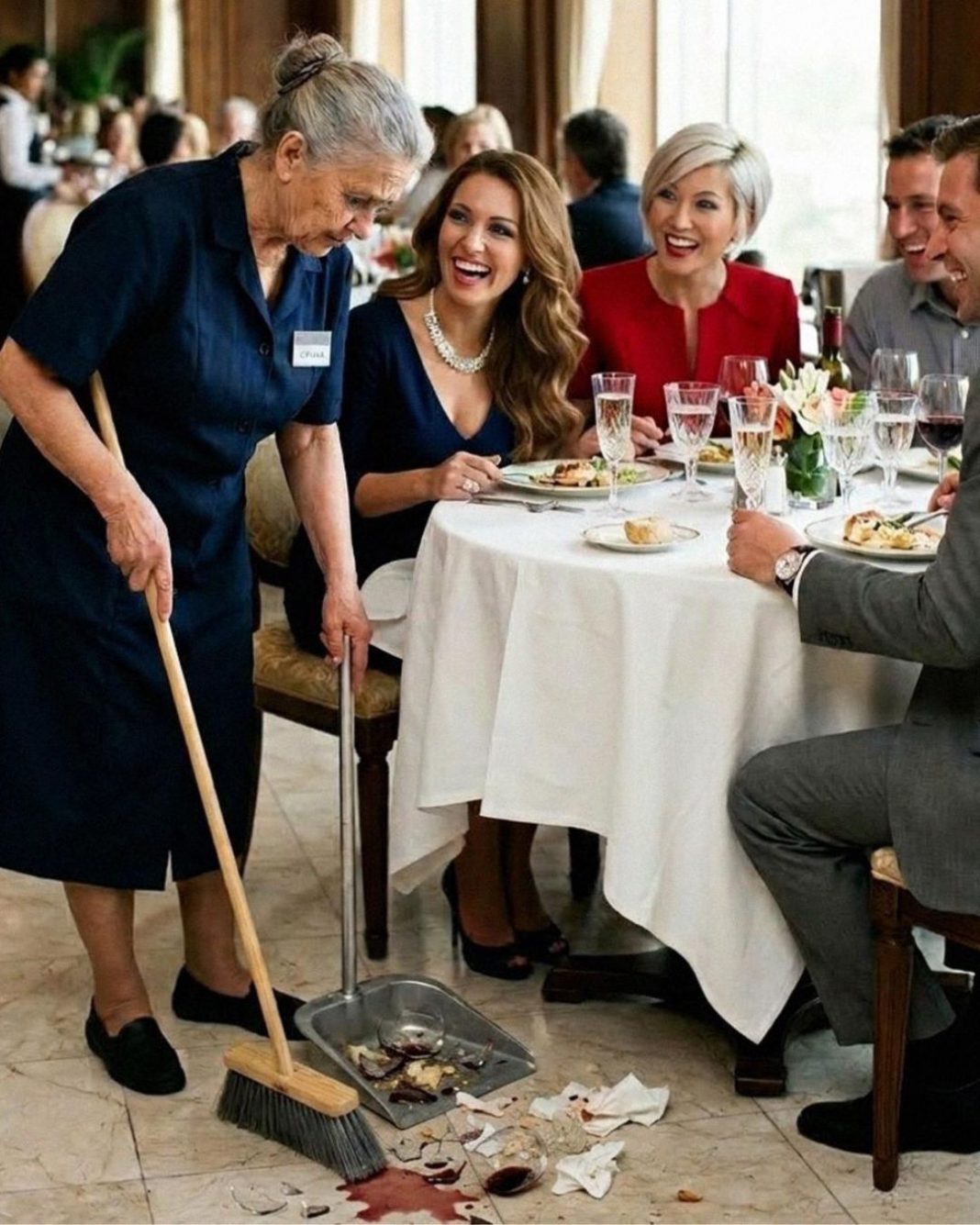 Čistačica, obučena skromno, sa tragovima godina rada, pokušavala je da očisti nered što je brže mogla, ne želeći da ometa nikog. Međutim, bogati gosti su počeli da je ismijavaju. Rugali su se njenom izgledu, godinama i njenom poslu. Smijeh koji je usledio bio je bolan za svakoga ko ga je slušao, a čistačica je nastavljala da se izvinjava, iako nije imala razloga za to.