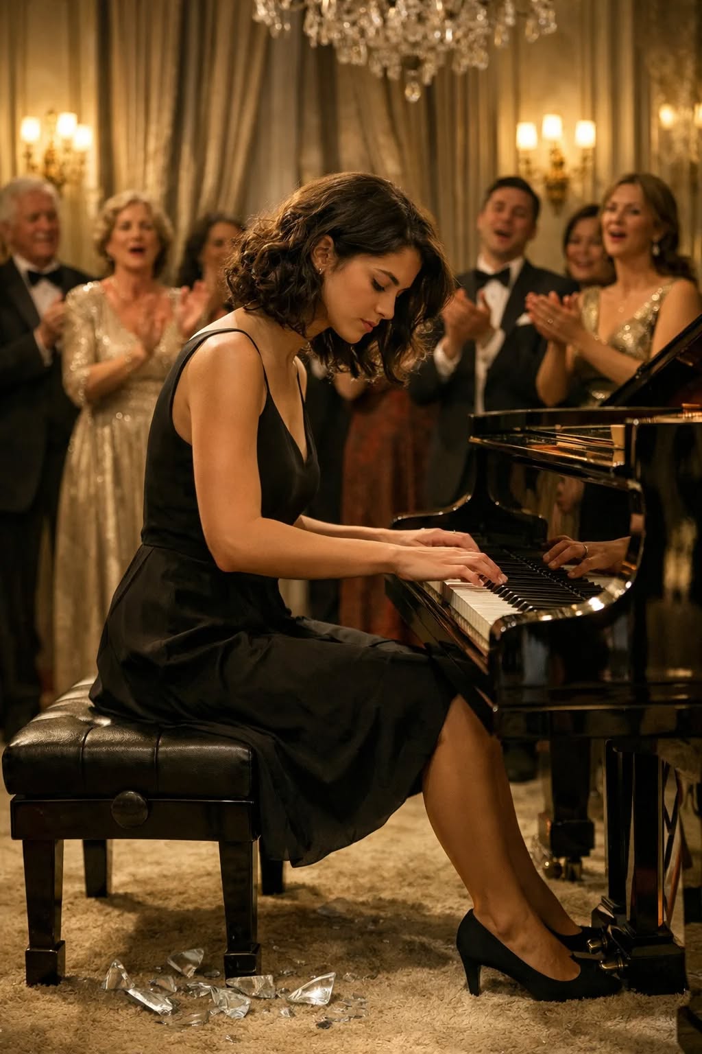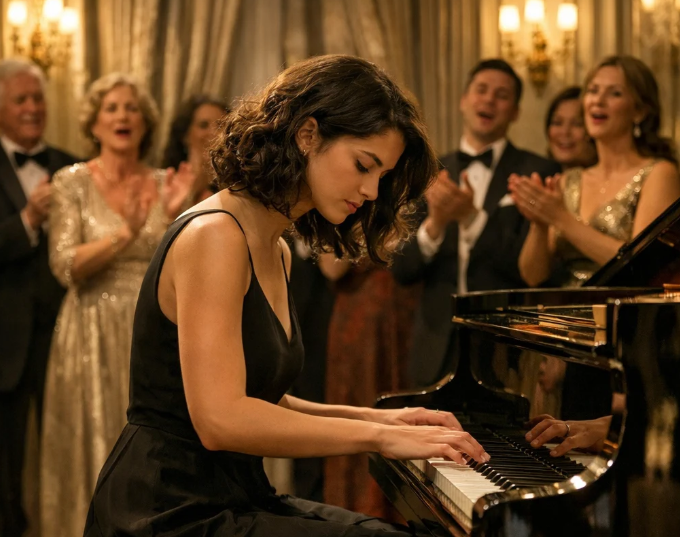 Polako je ustala, skinula radnu odjeću koja ju je simbolizirala kao nekoga ko služi drugima, i otkrila elegantnu haljinu koju je nosila ispod. Taj čin bio je više od običnog pokreta — bio je znak promjene, povratka sebi i vlastitom identitetu.Bez obzira na poglede i pokušaje da je zaustave, prišla je klaviru i sjela. U prostoriji je zavladala tišina, ona vrsta tišine koja dolazi prije nečeg velikog. Kada su njeni prsti dotakli dirke, prvi tonovi bili su tihi, gotovo neprimjetni, ali ubrzo su prerasli u snažnu i emotivnu melodiju koja je ispunila cijeli prostor.