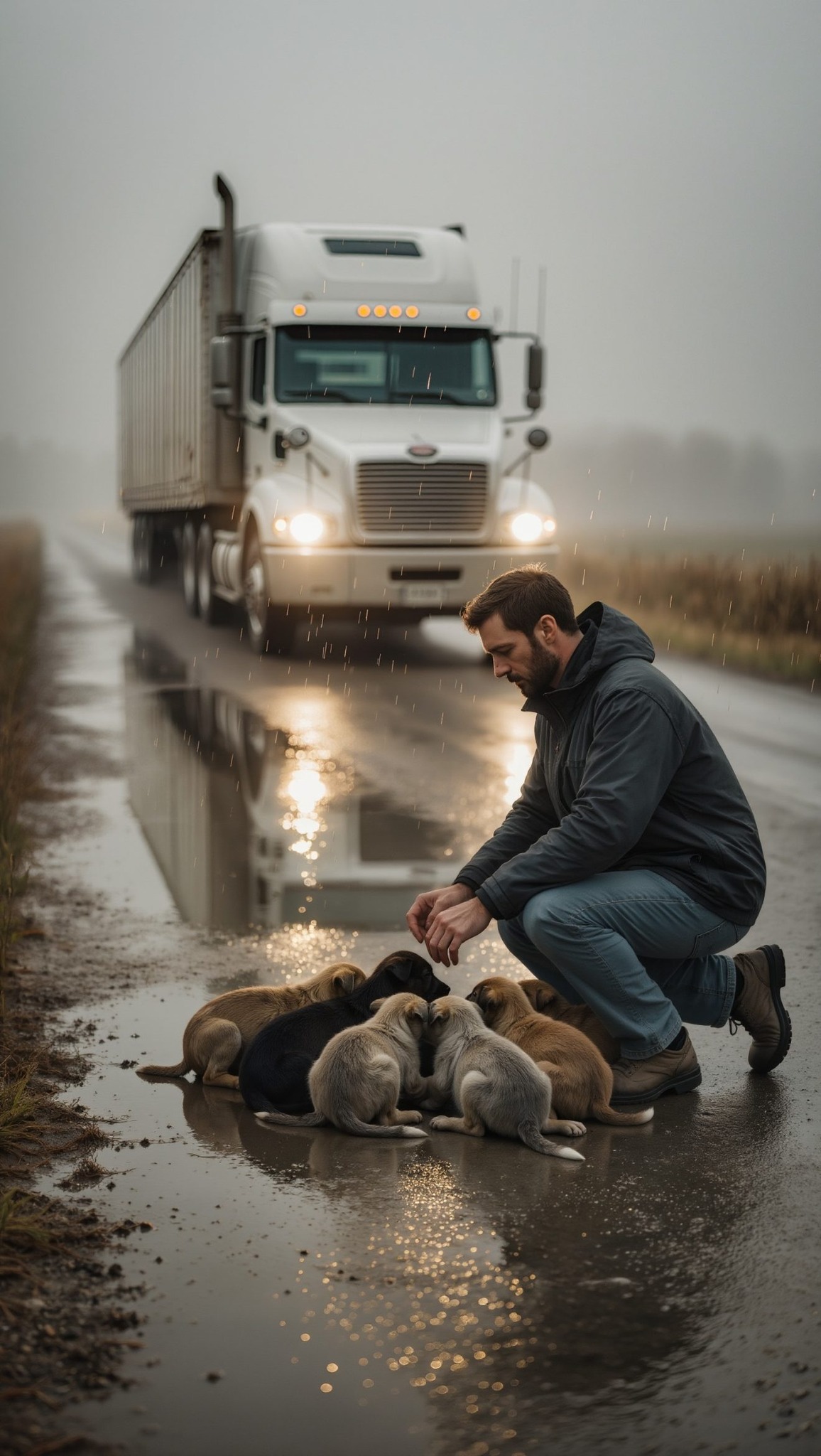 • Na cesti ih je bilo najmanje dvadeset. Različite boje, različite veličine, svi su bili sićušni, ranjivi i nemoćni. Neki su tiho cvilili, dok su drugi grebali po asfaltu, kao da nešto traže. Victor je odmah usporio, upalio sva svjetla na kamionu i zaustavio se nasred ceste. Iako se očekivao da će štenci pobjeći, oni nisu bježali. Naprotiv, činilo se kao da su ga čekali. Jedan od njih, crno-bijeli, kao da je bio vođa, hrabro je iskočio ispred ostalih i potrčao prema jarku, a Victor je odmah krenuo za njim. Na tom jarku je nešto otkrio što ga je duboko potreslo – stara kartonska kutija, potpuno natopljena kišom, okrenuta naopačke. Ispod nje su se krila tri najmanja štenca, hladna i slaba, jedva živa. Victor nije mogao vjerovati što je vidio.