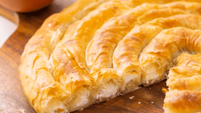 - Nakon toga, prelazi se na pripremu testa. Ako koristite zamrznuto lisnato testo, važno je da ga prvo odmrznete nekoliko minuta pre nego što počnete da ga razvlačite. Testo se zatim deli na dva dela – jedan deo će biti donji sloj, dok će drugi biti gornji. Prvi sloj testa treba ravnomerno rasporediti na pleh obložen papirom za pečenje, a zatim se prelije pripremljenim filom od sira. Sir se mora ravnomerno rasporediti po celokupnoj površini, a zatim se prekriva drugim slojem testa. Ivica treba da bude blago pritisnuta kako bi se svi delovi spojili, a krajnji rezultat bio kompaktan.